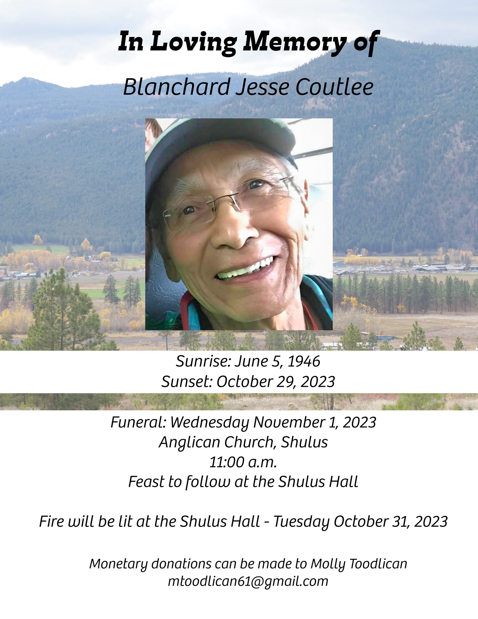 Terri Beckett In Featured It is with great sadness the Coutlee family announces the passing of Blanchard Jesse Coutlee. Sunrise June 5, 1946, Sunset October 29, 2023. Read More